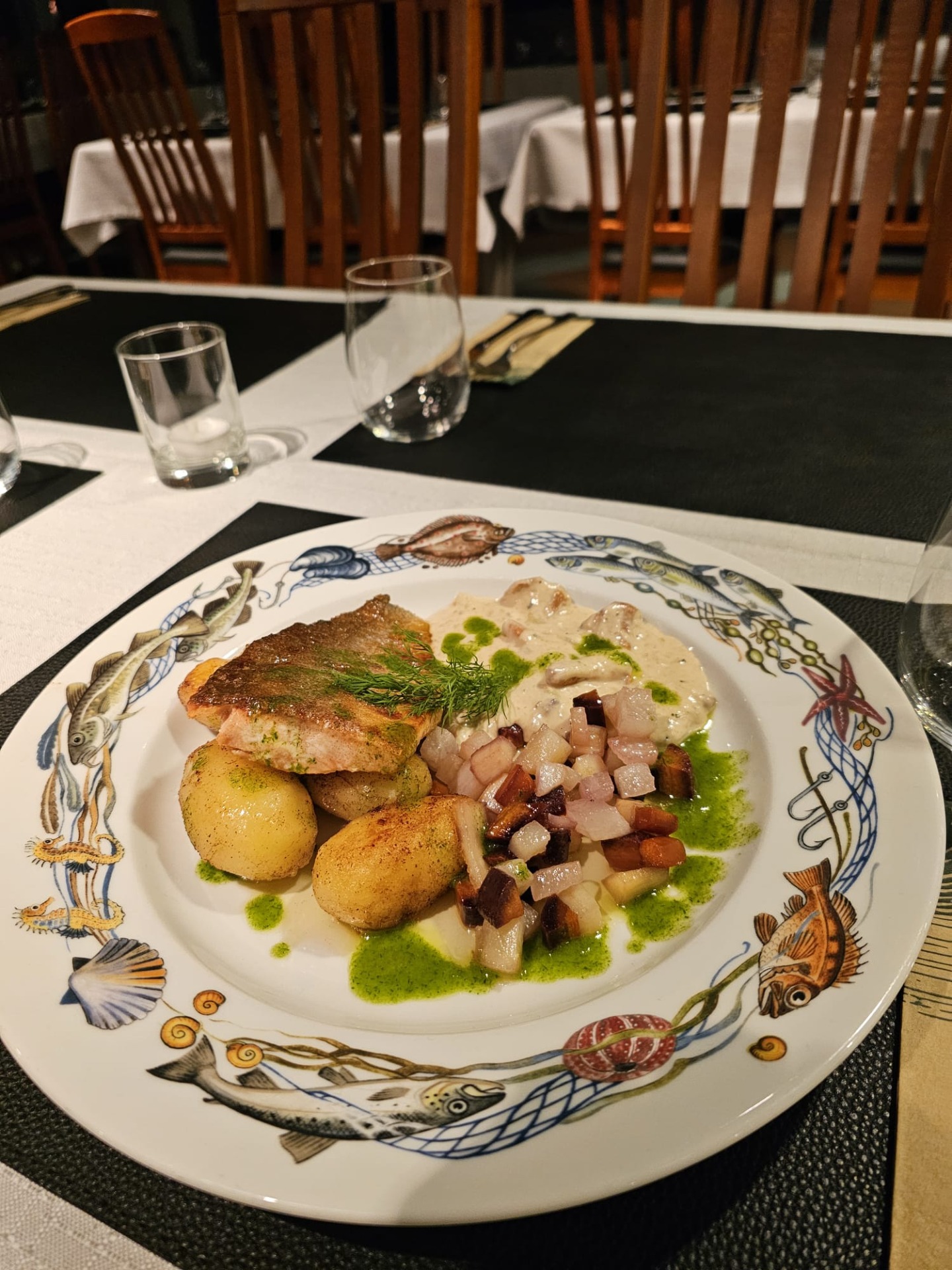paistettua rautua, sienikastiketta, säräjuureksia, puikulaa