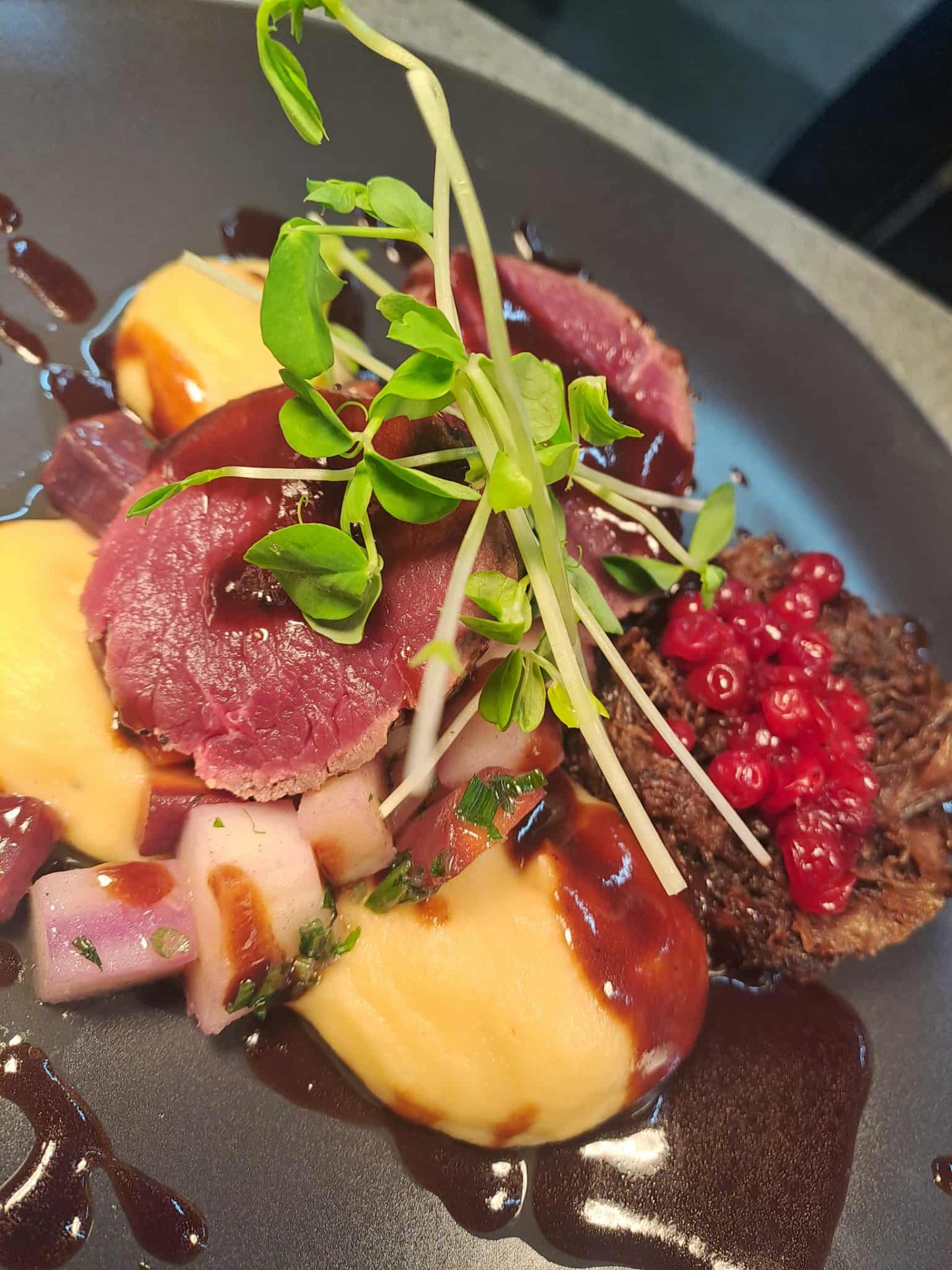 pitkään savustettua hirveä, savukermakastiketta, juureksia ja perunaa